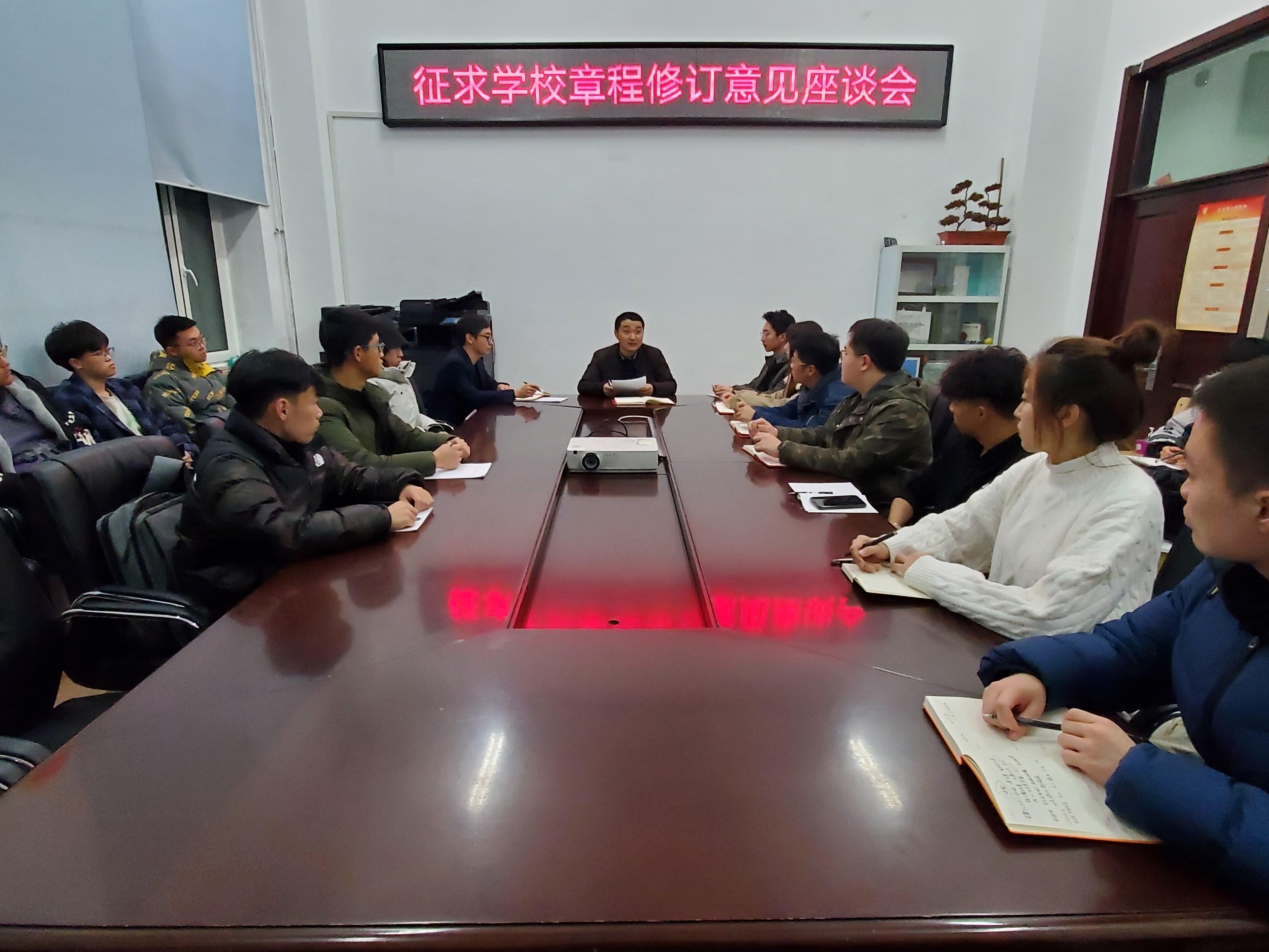 根据学校章程修订程序,为充分行使民主权利,高质量完成我校章程修订工作,11月2日晚,校团委在综合办公楼0112室组织召开了两场学校章程修订意见座谈会,校团委副书记宋天宇、综合发展部部长李东宸及学生代表等36人参加了座谈会。