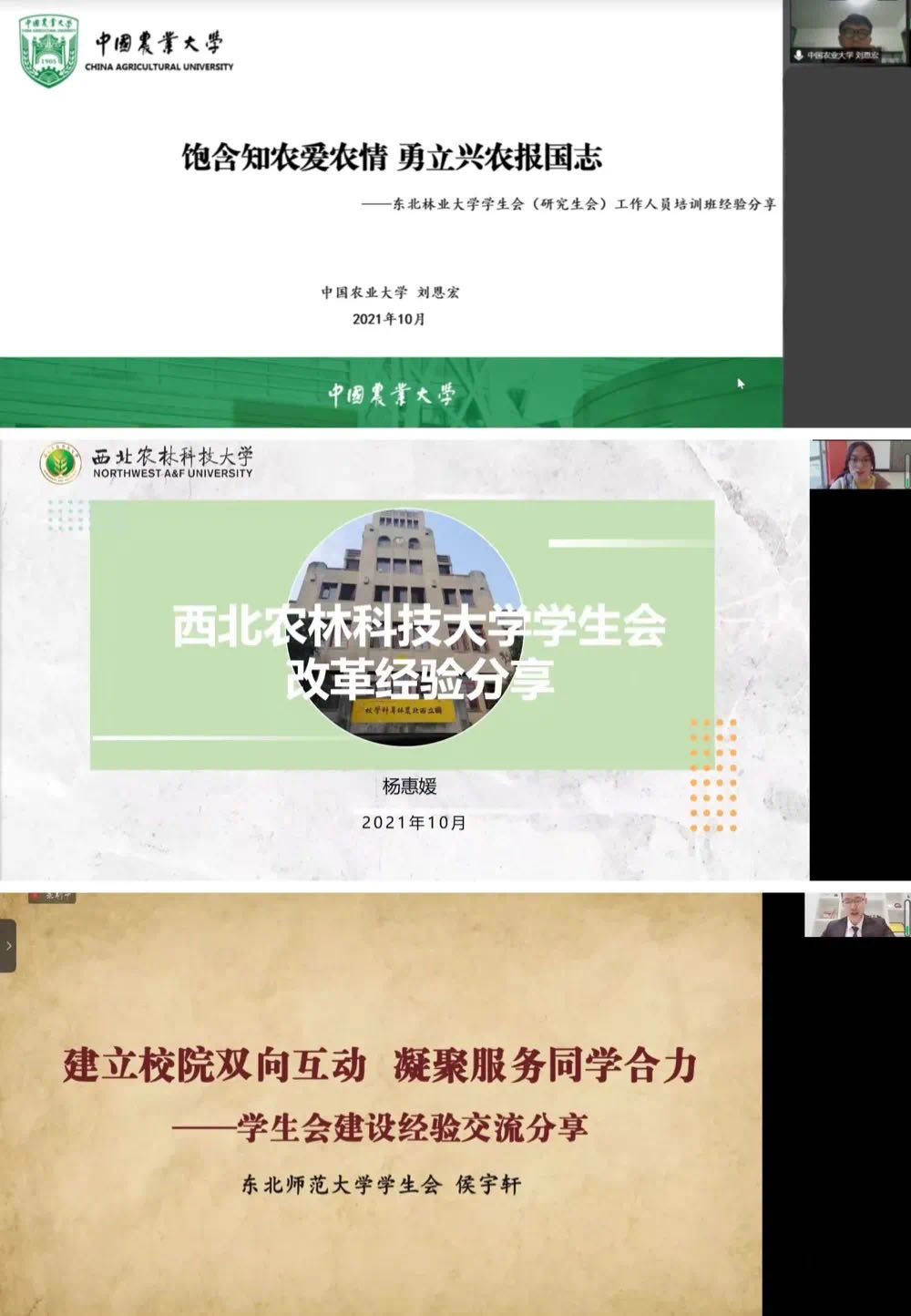 中国农业大学研究生会主席团成员刘恩宏、西北农林科技大学学生会执行主席杨惠媛及东北师范大学学生会主席团成员侯宇轩分别以“饱含知农爱农情,勇立兴农报国志”“点燃青春激情,汇聚青春才智,担当民族复兴大任的时代新人”“建立校院双向互动,凝聚服务同学合力”为主题,就各自高校学生会(研究生会)组织改革的经验做法和改革举措做了分享。