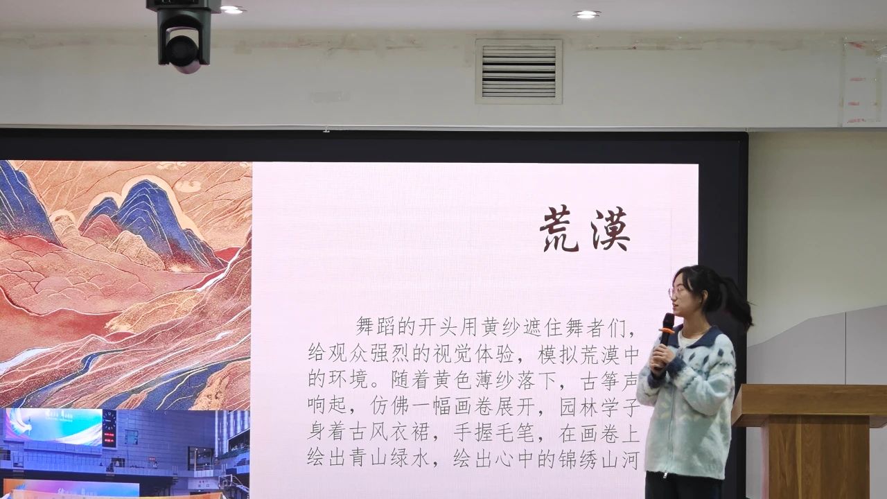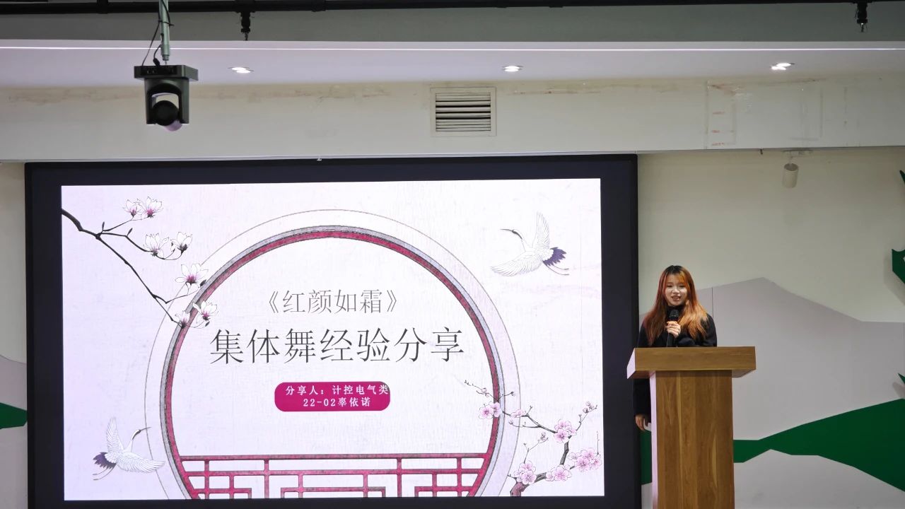 辜依诺从任务布置、选拔与排练、彩排与演出、前后对比44个部分展开分享。她分享了收到任务准备编排的过程,并通过照片向我们展示了紧锣密鼓的排练过程。接着,她就彩排中出现的两个问题分享了解决方案。她分享了当演出到来时,大家互相鼓励,回忆舞蹈动作的珍贵记忆。之后,她通过赛前、赛时舞蹈图片的前后对比,展现在各个成员的共同努力下取得的巨大进步。通过这次的经历,她勉励各位同学要怀揣热爱,奔赴山海,以辛勤浇灌的青春之花必然盛放。