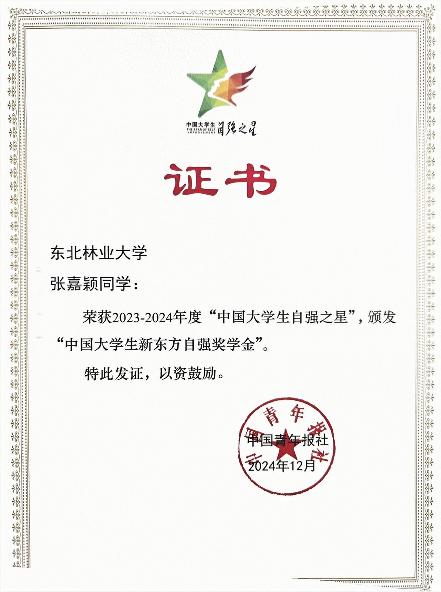 近日,2023—2024年度“中国大学生自强之星”奖学金获得者名单揭晓,学校理学院张嘉颖获评“中国大学生自强之星”荣誉称号,获得“中国大学生新东方自强奖学金”。