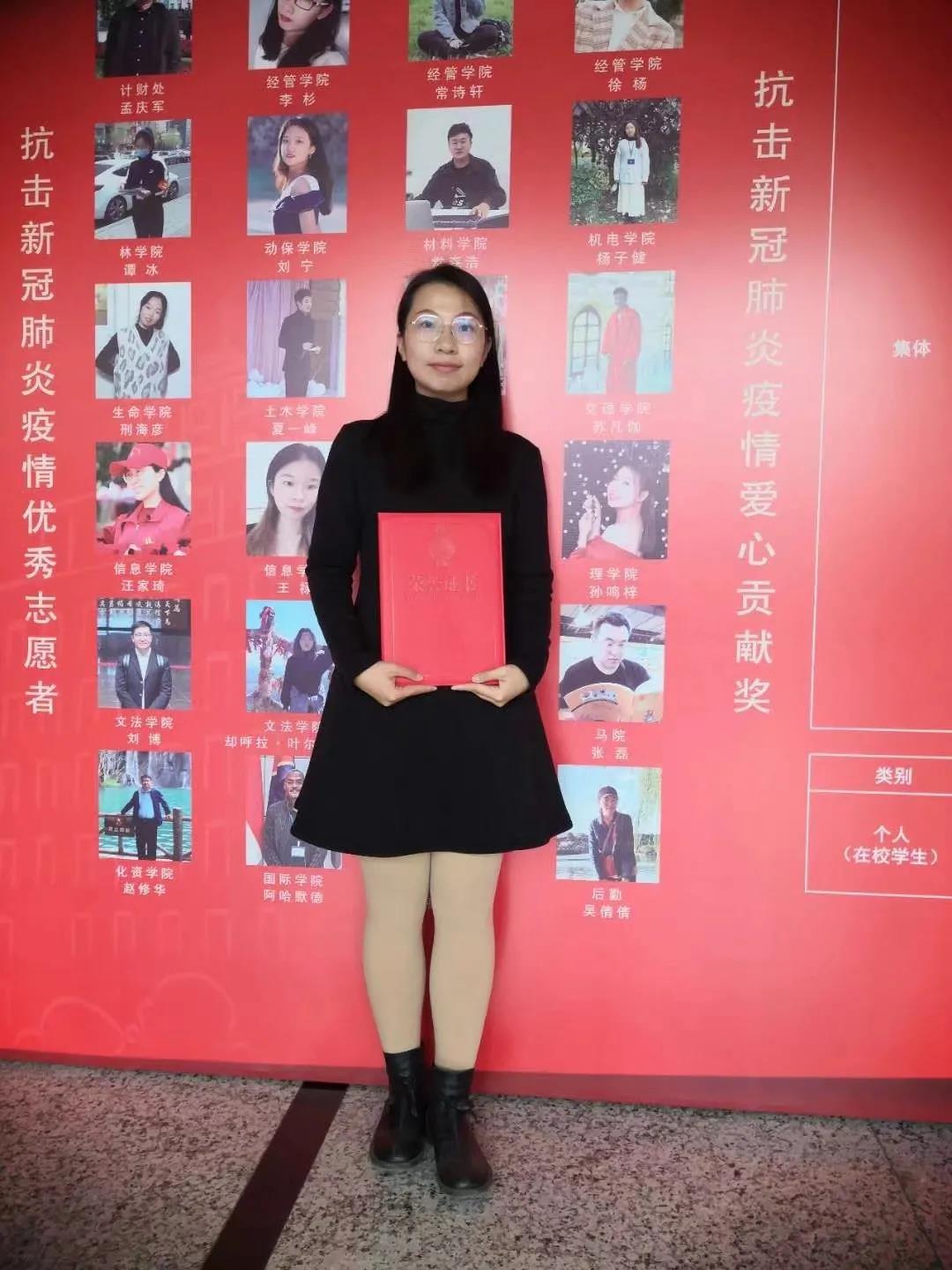 她把热心公益,投身教育当作一生的追求。对于未来,她充满着无穷的好奇心与求知欲,她始终牢记一名青年党员的担当,秉承“学参天地,德合自然”的校训,愿意将温暖与爱一直传递下去。