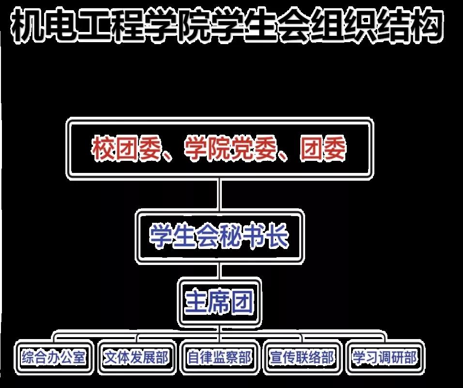 学院党委高度重视学生会政治建设,共同研制《机电工程学院学生会管理条例》《机电工程学院学生干部培养方案》《机电工程学院学生会工作人员承诺书》等相关制度文件。学生会组织构架为“主席团+工作部门”模式,现有主席团成员3人,工作人员29人,建立了“院班”两级体制机发挥了组织的整体功能。