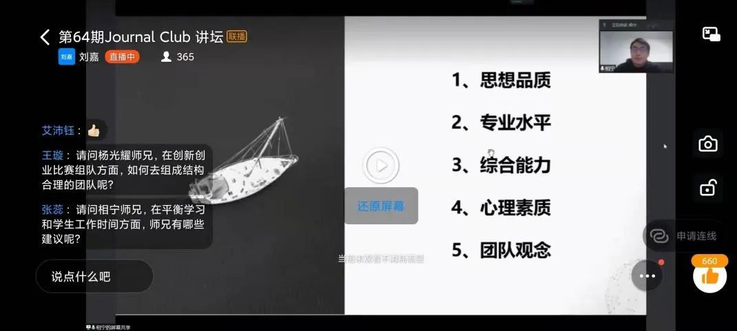 2021年12月12日18时,第64期Journal Club讲座在钉钉平台成功举办,近千人参加了本次活动。本次讲座有幸邀请了杨光耀、相宁两位同学做客直播间,他们结合自身的科研经历和奋斗心得,为我们描绘了一幅多彩的研究生生活画卷。
