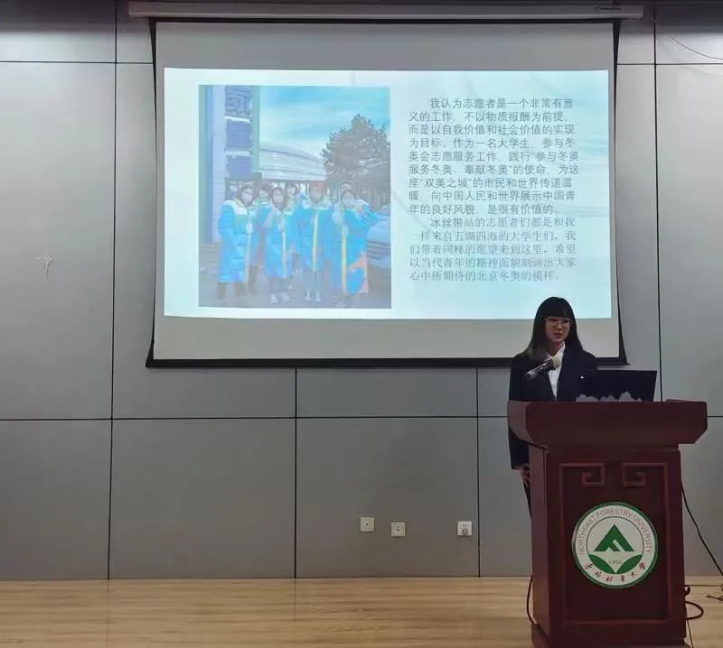 荆绚彧分享了在北京冬奥会期间在朝阳区城市志愿服务站(冬奥村站)担任志愿者的点滴历程和收获感悟,她以图文并茂的方式向同学们再次展现了冬奥志愿服务的火热盛况。他表示:“冬奥已经结束,友谊永不落幕,虽然和冬奥的故事已经落幕,但我对志愿服务的热情未减反增。”整理思绪,继续出发,永远年轻,永远热爱,永远向未来。这是她对自己未来的美好畅想。