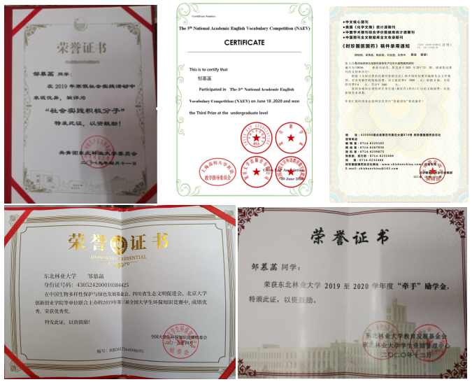 邹慕菡,中共党员,考研至中山大学生命科学学院。曾荣获第五届全国大学生学术英语词汇竞赛三等奖、学校暑期社会实践优秀团队三等奖、社会实践积极分子、牵手励志奖学金、校级学业奖学金等多项奖励荣誉,已通过英语四六级。