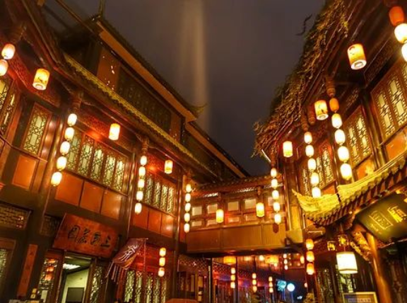 作为成都必不可少的打卡地,锦里古街与武侯祠一墙之隔,游客一般会在游玩武侯祠后,来此逛一逛,这里洋溢着成都特有的喧嚣和随意。这里各色美食也会令你垂涎三尺,有张飞牛肉、豆花、牛肉焦饼、钵钵鸡等,各具风味。锦里古街在夜幕来临时会亮起大红灯笼,这时酒吧、茶馆热闹非凡。其中比较有名的是莲花府邸酒吧,每晚都有当地歌手来此驻唱,逛累了,可以在这里小憩。同学们若是有机会来到成都,一定不要错过锦里古街哦。