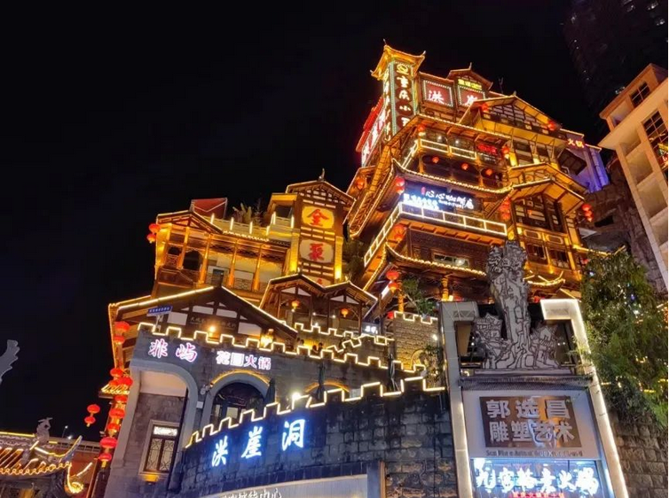 我来打卡的地方是重庆市洪崖洞,位于我的家乡重庆市。洪崖洞是重庆市重点景观工程,建筑面积4.6万平方米,主要景点由吊脚楼、仿古商业街等景观组成。洪崖洞一共有11层,夜晚灯光从晚上6点开灯,10点熄灯。可望吊脚群楼观洪崖滴翠,逛山城老街赏巴渝文化,烫山城火锅看两江汇流,品天下美食。形成了“一态、三绝、四街、八景”的经营形态,体现了巴渝文化休闲业态。同时,洪崖洞供应的传统食品和风味小吃也很多,欢迎大家来重庆!