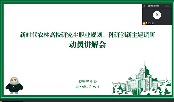 东北林业大学研究生会牵头“新时代下农林高校研究生职业规划、科研创新”主题调研实践,招募分散实践志愿者52人,已经取得阶段性成果,现将近期实践成果分享如下。7月25日,校研究生会通过腾讯会议召开了本次社会实践动员会,会上,校研究生会第二任期执行主席张梦媛详细讲解了本次社会实践的具体要求及日程安排,细致解答了同学们对于本次实践活动的疑惑和问题。