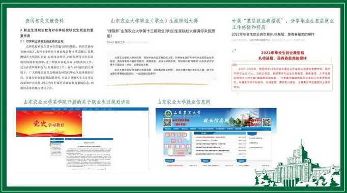 通过查阅一系列资料,汪莹发现农林类高校研究生有较好的职业规划意识,能够在研究生入学后对自身的职业方向进行规划,同时,学校层面也开设了众多关于研究生职业生涯规划的课程与讲座,十分重视研究生群体的职业规划。此外,通过与山东农业大学的硕士研究生进行线上交流时也发现,该校低年级的硕士研究生已经对自身的实习与求职做了一系列准备。整体来说农林类研究生的职业规划氛围较好,但也存在个别研究生有职业规划不清晰的问题。