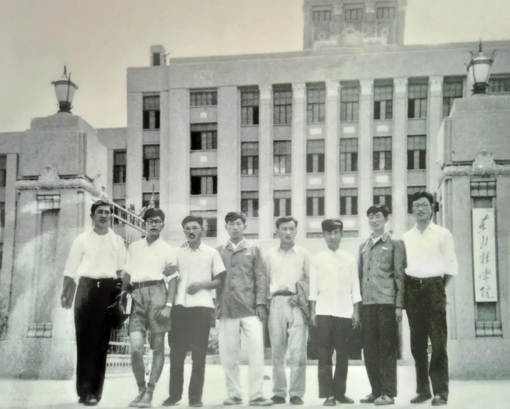 在塞罕坝坚守一辈子的李信(左一)与同学在学校主楼前合影