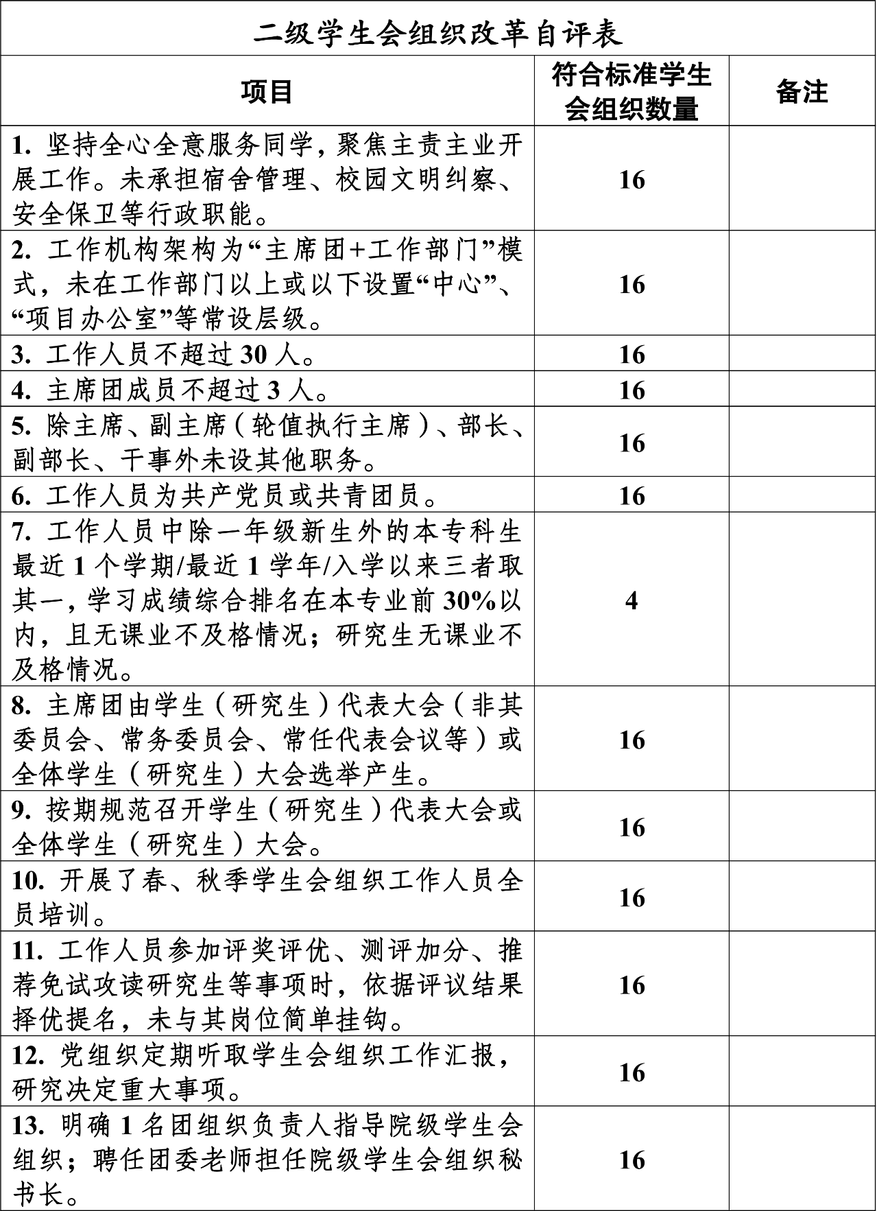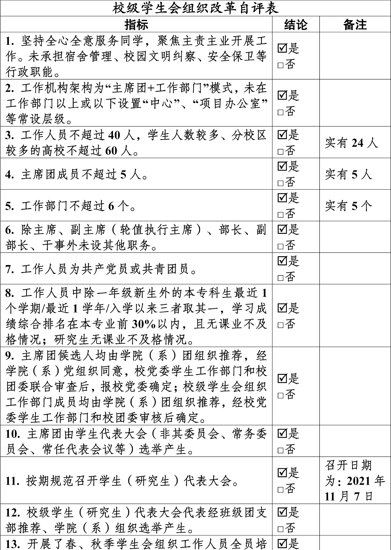 为落实共青团中央、教育部、全国学联联合下发的《关于推动高校学生会(研究生会)深化改革的若干意见》,并结合《关于巩固高校学生会(研究生会)改革成果的若干措施》文件要求,接受广大师生监督,现将我校2021—2022学年学生会改革情况公开如下。