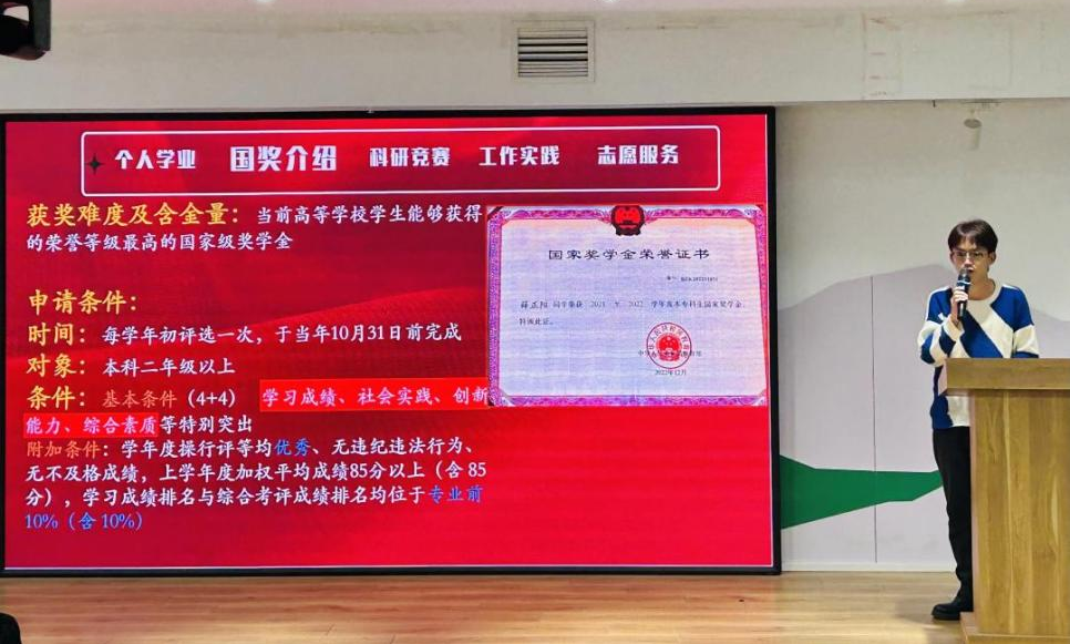 薛正阳开篇详细介绍了国家奖学金的申请条件和含金量,勉励广大东林学子积极争取。而后在科研竞赛方面,他积极参加各类比赛,通过不断地挑战自己,积累了丰富的科研经验。在工作实践方面,他充分发挥专业优势,为所在团队贡献力量。在志愿服务方面,他始终秉持着“奉献、友爱、互助、进步”的志愿者精神,积极参与各类公益活动,充分展现了国奖获得者的风采。最后,他勉励同学们要勤学不辍,脚踏实地,用奋斗书写青春华章、践行东林精神。