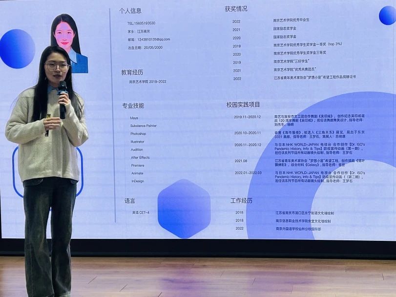 郑杨纬哲从项目经历和实践学习等2个方面展开分享。首先在项目经历方面,她参与了舞剧《吴印咸》,通过一张张舞台照将吴印咸先生的故事向我们娓娓道来,生动诠释了吴印咸先生爱党爱国、勇敢奋斗的精神;在制作动画的过程中,她学会了如何将舞蹈与动画巧妙地结合在一起,让整个画面变得更加鲜活、生动;她还参与过《海市蜃楼》作品的拍摄,在此期间她的审美能力与视觉表达方面在拍摄过程中得到了提升。而后在实践学习方面,她鼓励同学们积极参与项目,在处理事务中不断提高自己的实践能力和解决问题的能力。最后,她希望同学们笃行不怠、奋力拼搏,努力把学习收获转化为创造美好人生和推动事业发展的生动实践!