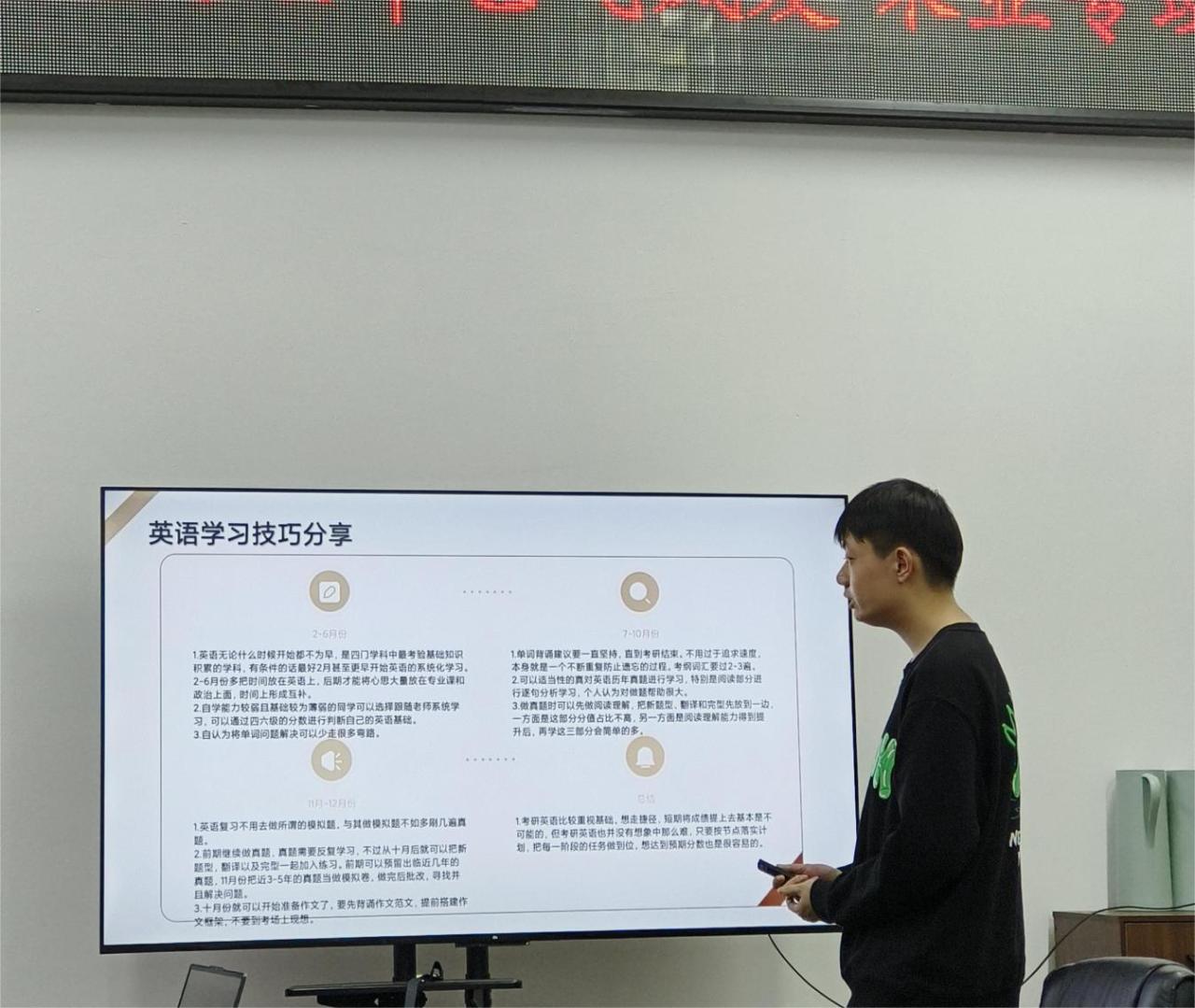 在分享时张琨麟同学提到,备考考研需要科学的规划和合理的时间安排。要根据考试科目和自身情况,制定有效的学习计划和进度表。合理分配各科目的学习时间,加强重点和薄弱环节的复习,有针对性地提升自己的知识水平和应试能力。同时,要注重学习方法和技巧的培养,不断总结和改进学习方法,提高学习效率,逐步积累自信和信心。