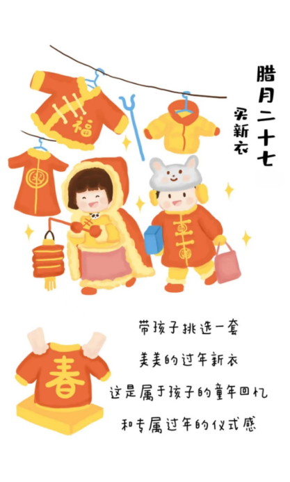 “二十七,赶大集”。腊月二十七被称为年货节,大家准备好年货,为小孩子准备一身新衣服、漂漂亮亮地过大年!