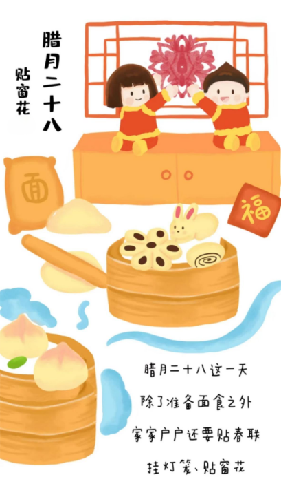 “二十八,把面发”。正月初一到十五是不能蒸馒头的,所以二十八这一天要准备好接近半个月的主食。在这天“把面发”,等到二十九“蒸馒头”。同时,为了营造过年的氛围。家家户户张灯结彩,争先恐后地布置着自己的家。