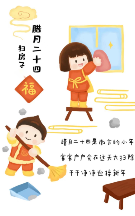“二十四,扫房子”的风俗,由来已久,是我国人民素有的传统习惯。家家户户都要打扫环境,清洗各种器具,拆洗被褥窗帘。在腊月里扫尘有“除陈布新”的涵义。腊月扫尘,就是把家里一切的“穷运”、“晦气”都扫出去,以期盼来年运势更好。