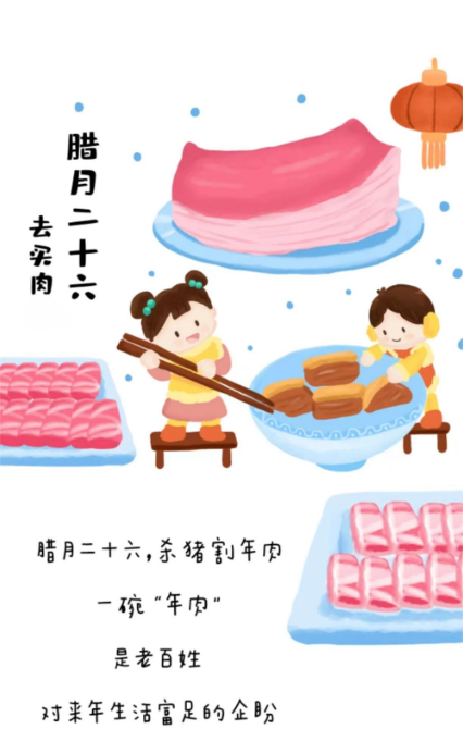 “二十六,杀年猪”是说在这一天主要筹备过年的肉食。在过去,社会经济不发达,人们生活艰苦,往往在年节时才能吃到肉,故称为“年肉”。