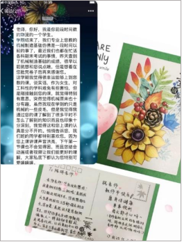 从每学期第一堂课自信满满微笑走向讲台,到学期结课同学们满怀深情热烈的掌声,与每一届学生的“教学相长”都是这样令我感动难忘。回顾与同学们相处的点点滴滴,真诚、鼓励、宽容、微笑、欣赏,给同学们营造一种愉悦和谐、舒适宽松的学习环境。我会因参加学科竞赛时同学们的自信满满而感动,他们告诉我什么是“有志者事竟成”。我会因在读和毕业同学的信任而感动,他们谈论人生规划,期待他们的卓越人生。我会因收到同学们的报喜留言而感动,他们第一时间告诉我考研成绩,我真诚祝福他们。我会因校园里笑着跑来问候的同学而感动,他们有时与我分享读研及就业计划,他们也可能就是高兴的跑过来问好,我感受到的是美好。我也会因同学匆匆跑来邀请我到运动场观看他们的民族舞蹈表演而感动,他们让我感受阳光和正能量。我会在教师节收到学生甄选的明信片而感动,信纸上满满的爱,即使她不是我教学专业的同学,创新比赛的指导让我们相识并成为益友。我会因结课后收到同学的微信留言而感动,女生们说“突然觉得机械原来也十分有趣”……回忆起一件件与同学们的接触,感动萦绕心头,教师是感受爱的职业。