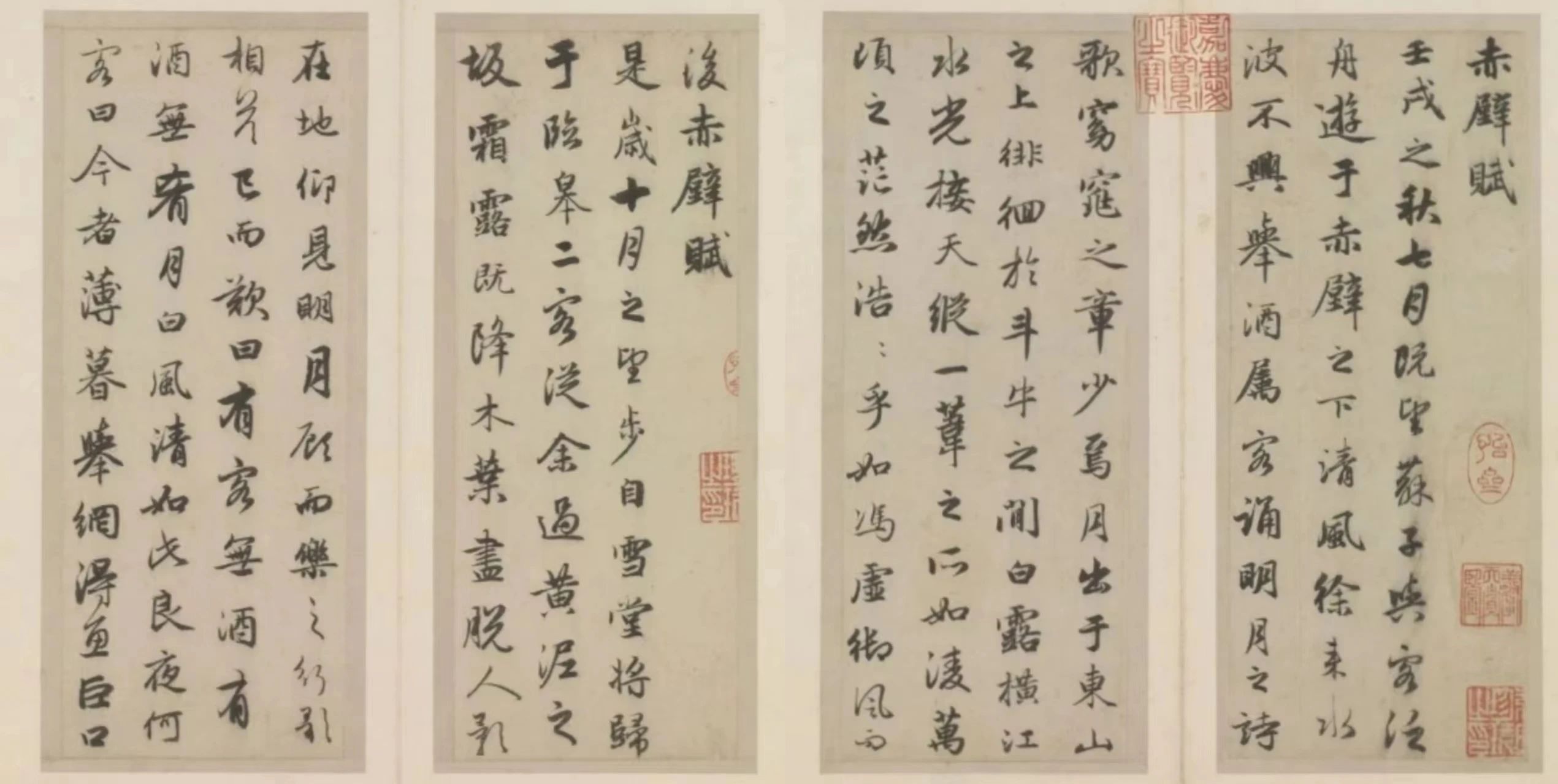 《前赤壁赋》与《后赤壁赋》是元代书法家赵孟頫的书法佳作,以其独特的艺术魅力与人文精神成为中国书法重要的传世佳作。《前赤壁赋》与《后赤壁赋》中,赵孟頫采用行楷的书写方式,用笔圆润遒劲,线条流畅自然,整体给人一种高雅,古朴的感觉;从文章内容来看,赵孟頫以苏轼的原文为基础,通过笔墨将自己的对于赤壁的情感融入其中,传达了自己对于赤壁的感受和对于人生的不断思考。