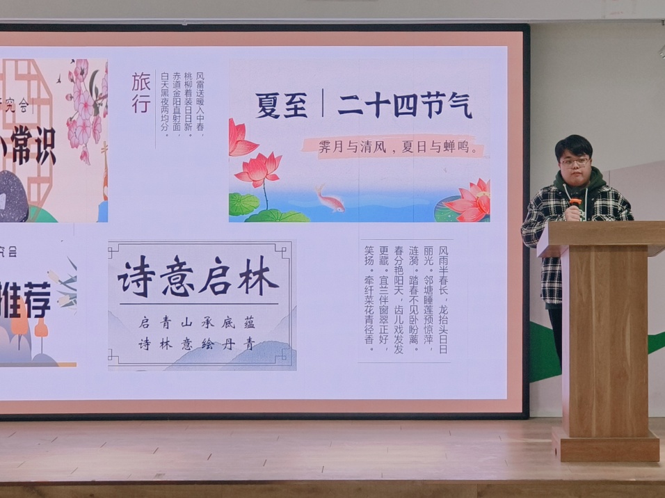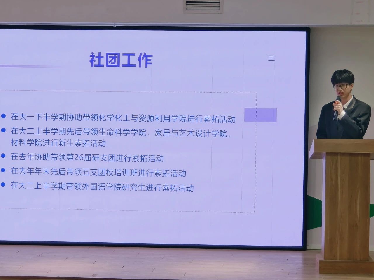尚卓航首先通过图片向大家展示他所在的社团在各种评选中所获得的荣誉奖项,一条条奖项无一不彰显着社团会员的努力与汗水。随后,他介绍自己在启林研究会中的成长经历,从最开始参与各种活动,与社团同伴们共同成长,再到成为社团负责人,见证着新同学们的加入,所表现的不仅是对爱好的热忱,更是与社团间的深厚羁绊。最后,他希望社团能为同学们提供更丰富的实践平台,每个人都能对社团充满激情和热爱,可以在社团中感受到不一样的大学生活。