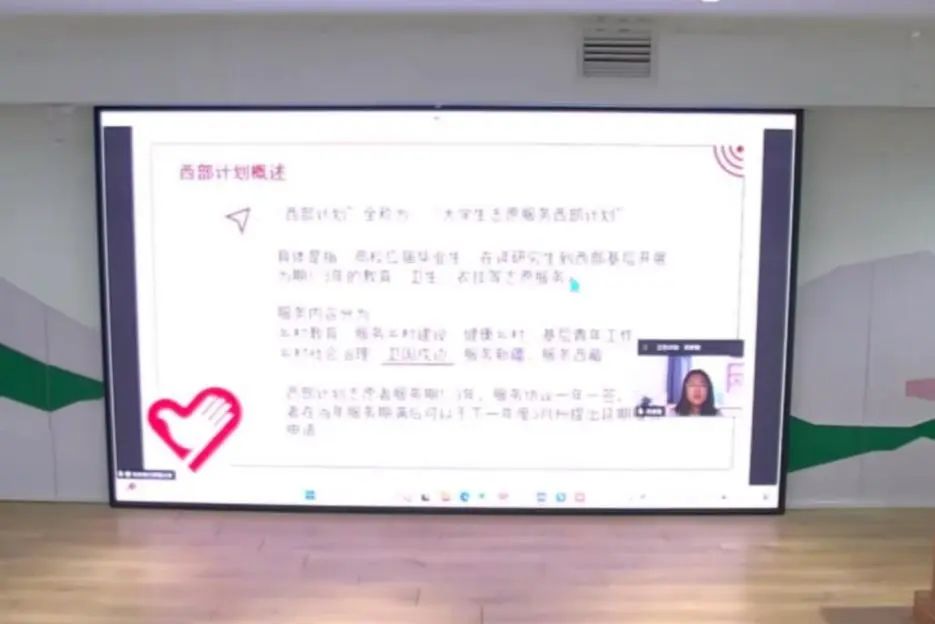 周紫萱将参加“大学生志愿服务西部计划”的经历与同学们倾情分享。她结合自己参加“西部计划”的亲身经历,在生动分享志愿服务生活见闻的同时,详细介绍了“西部计划”的各项保障政策,包括保留应届生身份、学业加分、定向招录等,并说明了服务地对志愿者的联系与支持,如培训、派遣、休假、生活补助、保险等待遇,以及党团组织关系的转入。这些政策旨在确保志愿者在西部计划服务期间得到充分的支持和保障,同时也为他们未来的学业和职业发展提供了有力支持。最后,她希望同学们能了解并参与“西部计划”,在寻找未来方向的同时为祖国贡献青春力量。