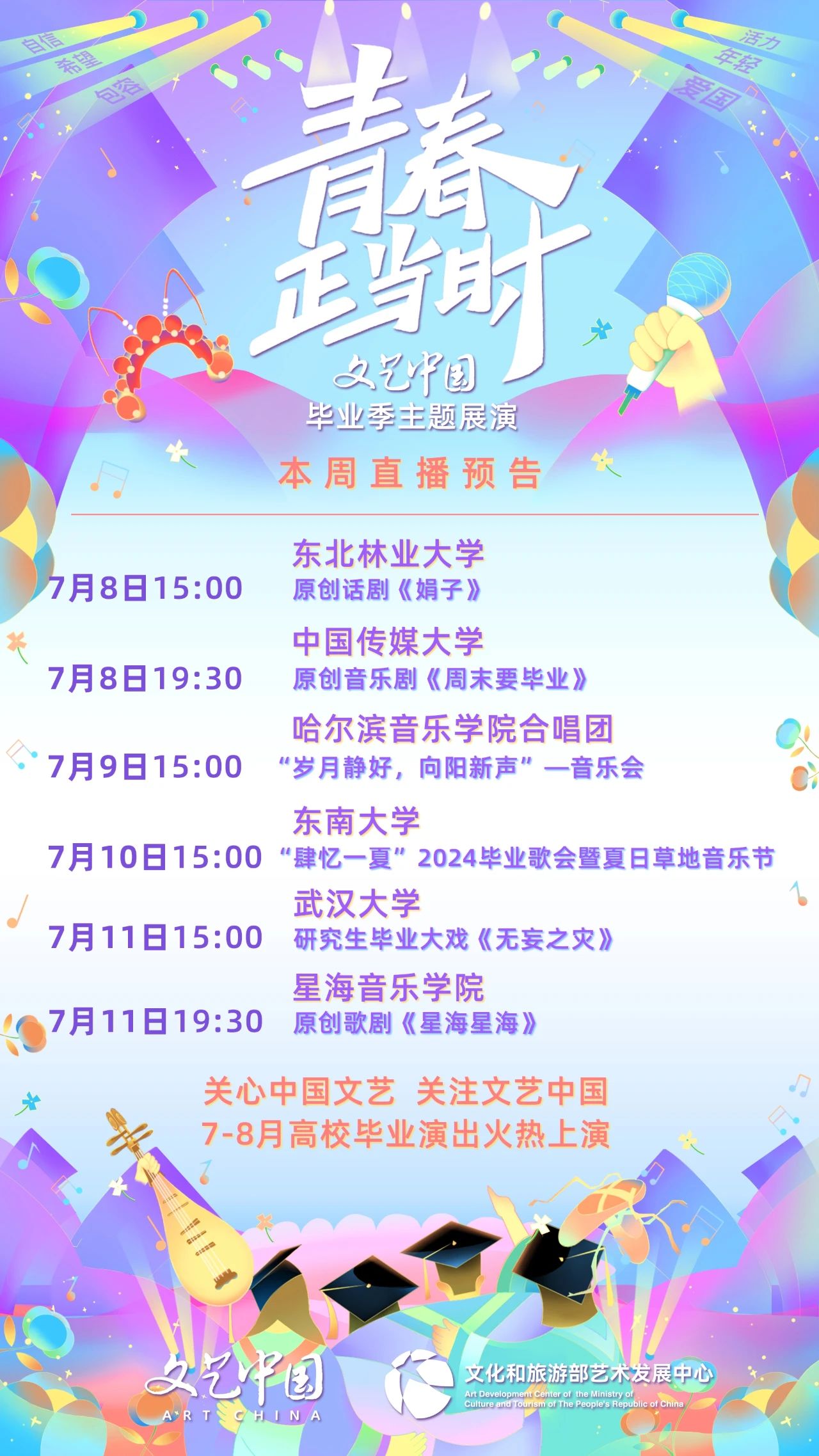 此次“青春正当时”文艺中国毕业季主题展演活动将于7月至8月期间,在文艺中国、央视网、新华网、人民日报、光明网等新媒体平台同步展播。活动不仅将优秀的高校舞台艺术作品推广至更广泛的观众群体,也将促进高校间美育成果互相交流,让线上观众共同感受大学生们的爱国情怀、才华创意、年轻活力、自信希望等多重魅力。青春正当时,我们在路上。请持续关注“青春正当时”文艺中国毕业季主题展演活动,也祝愿广大的毕业生一路繁花似锦,不负青春年华。