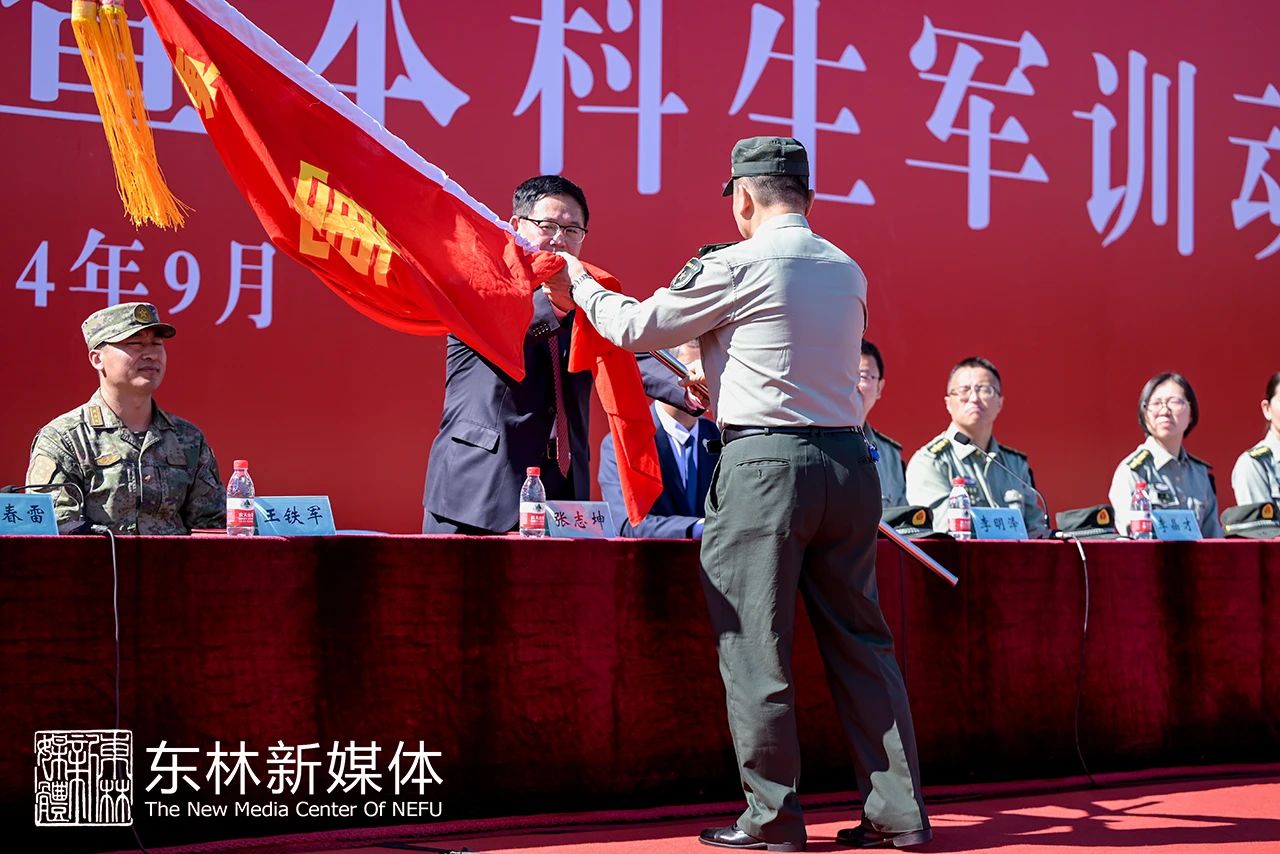 张志坤向军训团授旗。奥林学院党委副书记、六营营长罗伟代表学生单位接旗。